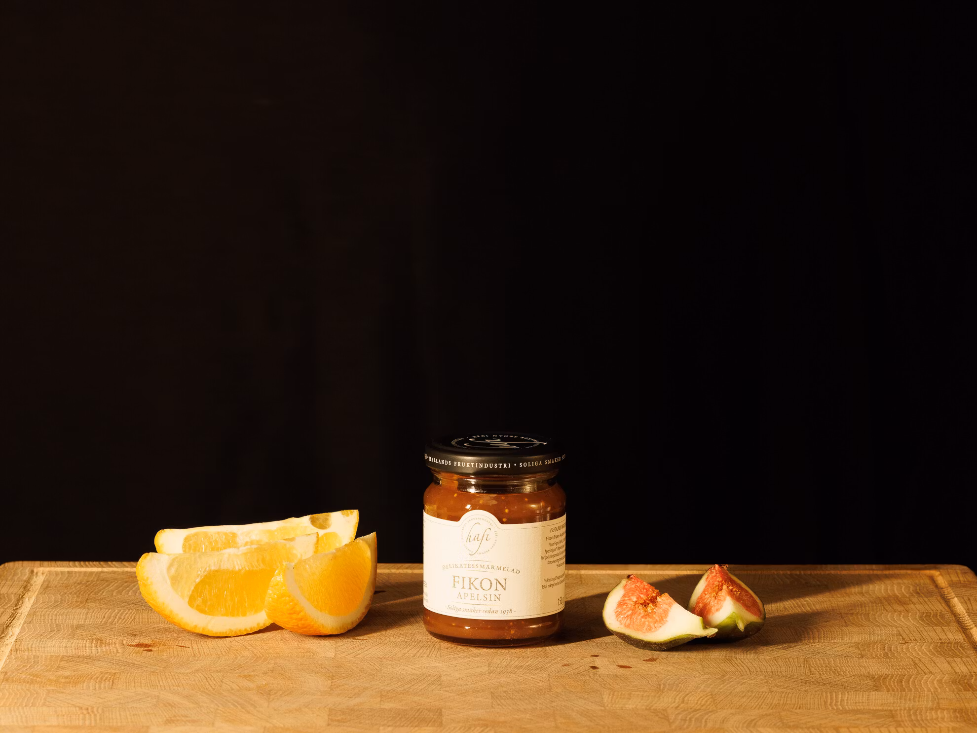 Marmelad från Hallands Fruktindustri med smak av fikon och apelsin. Perfekt på ostbrickan och smakar extra gott tillsammans med Pigan-vitmögelost. Marmeladen är också god i bakverk eller i kvargen.