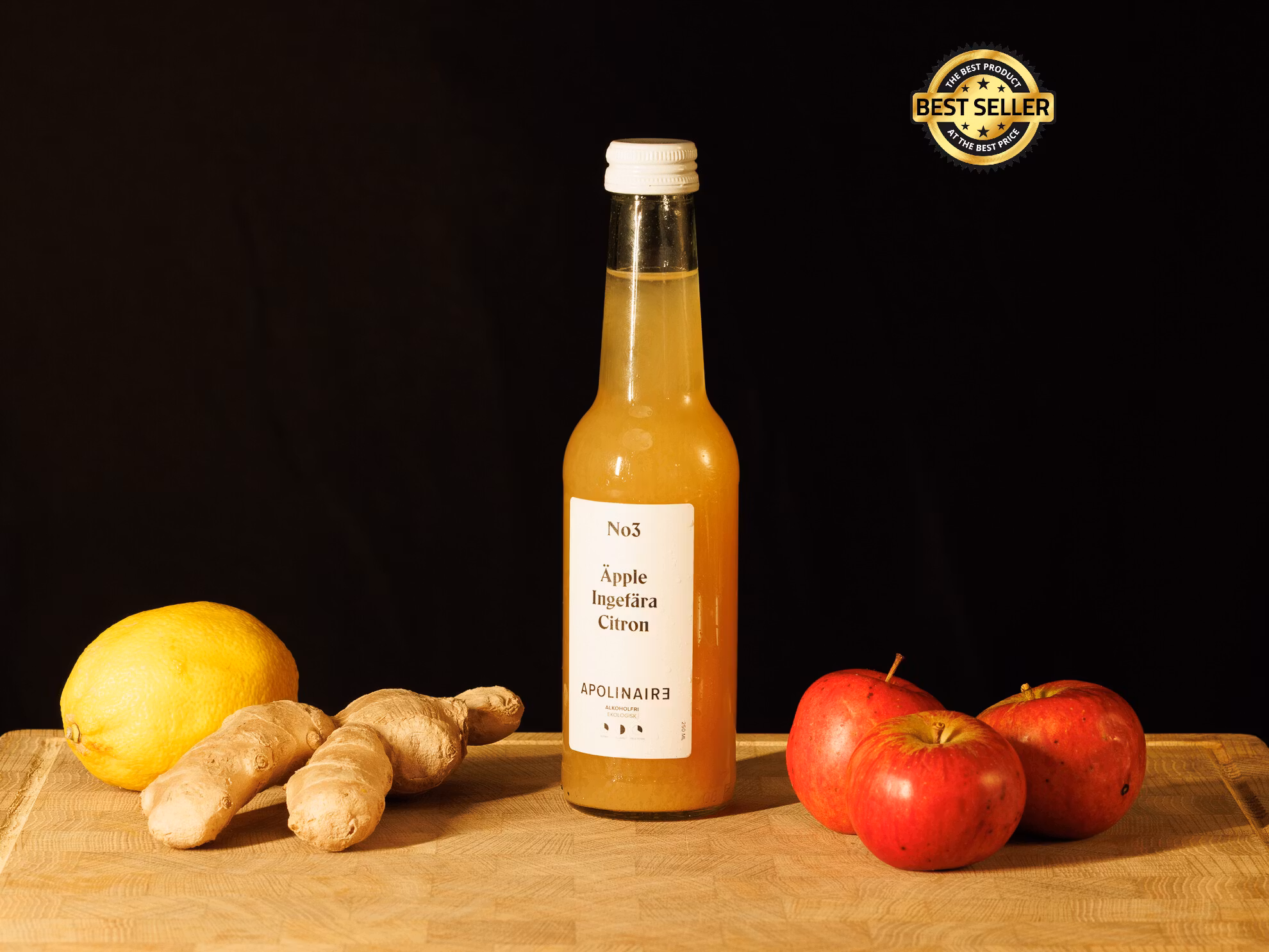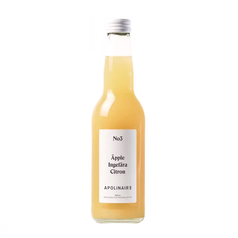No3 från Apolinaire dryck är Sommelierens favorit. No 3 är gjord på utvalda äpple, citron och ingefära. Sötman i äpplet balanserar syran och beskan fint från citronens skal och saft, och dämpar även ingefärans hetta. Resultatet i flaskan? Hög syra och kittlande styrka. No3 passar bra till: Sushi, heta fisk- och skaldjursrätter samt kyckling med thailändska smaker. Ett bra alkoholfritt alternativ till Riesling Spätlese från Rheingau.