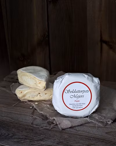 Pigan är en prisbelönt vitmögelost gjord av Soldattorpets mejeri i Hyby. Den är krämig, mild och smakrik likt en camembert eller brie. En lättgillad ost som passar extra bra på ostbrickan tillsammans med HAFIs marmelader och rågknäcke. Gjord av pastöriserad mjölk. (Ca 210g)